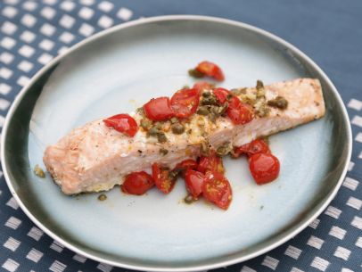 Season the salmon on both sides with salt and pepper. Place each salmon fillet on a sheet of aluminum foil and top with a few tablespoons of the tomato mixture. Fold the foil sheets into packets. (If making this recipe in advance, store the packets on a baking sheet in the refrigerator until time to grill.)
