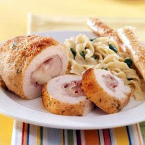 Flatten the chicken to 1/4 in thickness. Place a slice of provolone cheese and ham on each piece of chicken. Roll up from a short side and tuck in ends; secure with a toothpick