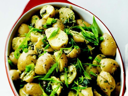 Drain cooked potatoes well and toss while still hot into dressing and toss gently to coat. Serve warm or at room temp.