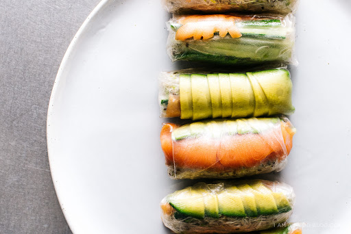 Take a rice paper wrapper and completely submerge it in a bowl of hot tap water for 10-15 seconds. Place the wrapper on a plate or cutting board – it’ll continue to soften as your assembling your roll. Add fillings as desired: avocado, smoked salmon, cucumbers, sprouts or noodles. Fold the bottom half of the wrapper up over the filling, hold the fold in place, fold in the sides and roll. Repeat as needed. Dip in the miso sesame dressing or fish sauce vinaigrette and enjoy!