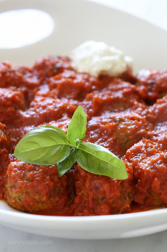 Heat the sauce in a large deep skillet to warm the sauce, about 4 to 5 minutes. Add the meatballs to the sauce and simmer for 5 minutes. Garnish the meatballs with fresh basil leaves and serve with ricotta or vegan parm if desired.