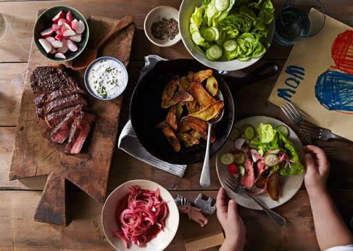 Slice steak and serve with horseradish dressing, potatoes, cucumber, radishes, greens, and Pickled Red Onions.