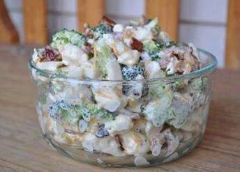 Combine the chopped broccoli and cauliflower in a large bowl. In a separate bowl, combine the mayonnaise, sour cream, sugar, and salt to make a creamy dressing. Add the dressing to the broccoli–cauliflower mix, stirring to evenly coat the vegetables. Stir in the bacon and the cheese, reserving a small amount to sprinkle on top of the salad just before serving.