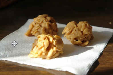 Bring sugar and syrup to a boil. Meanwhile, pour cornflakes into separate bowl. Take off heat when sugar mixture boils & stir in peanut butter until smooth. Pour over the cornflakes, and fold it all together. Drop by the spoonful or cookie scoop onto waxed paper. Makes anywhere from 30-40.