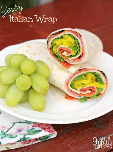 •Layer meats, cheese, lettuce leaves, and banana peppers on top of a flour tortilla.