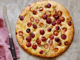 Brush the tops of the dough with olive oil and sprinkle the grapes, raw sugar, coarse sea salt and rosemary evenly over the dough. Bake until the crust is golden brown and puffed around the edges, about 15 minutes. Let cool a bit before serving. Serve warm or at room temperature.