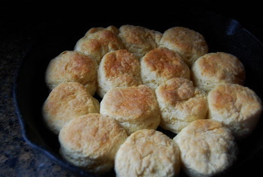 Roll out the dough until it's 1/4 of an inch think, then fold it in half. Using a round biscuit cutter (you can use a glass or a cup if you don't have a biscuit cutter), cut out the biscuits from the folded dough. Place on a greased baking sheet or in a cast-iron skillet close together, about 1/8 of an inch apart (so they rise up not out), and bake for 15 minutes or until the tops are golden brown.