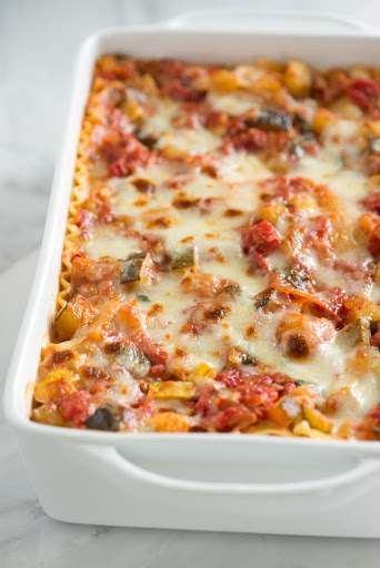 Spoon just enough vegetable mixture into the baking dish to lightly cover bottom (about 1 cup). Arrange four noodles lengthwise and side by side to cover the bottom. (If the noodles are short on one end, you may need to cut an extra noodle and place into dish to cover where the other noodles have not).