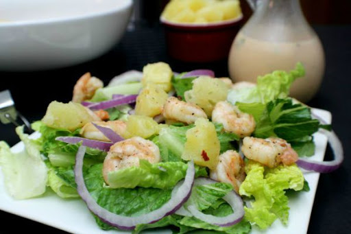 A refreshing spicy sauteed shrimp with pineapple drizzled with a dressing infused with fruit and peppers.