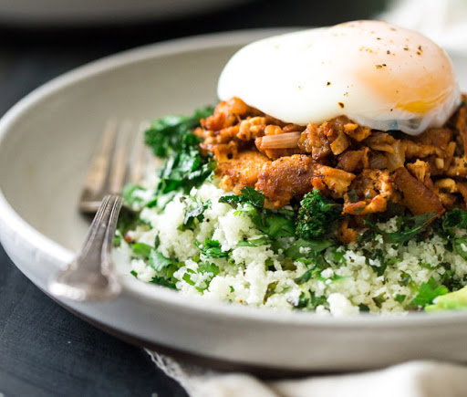 Toss the cauliflower rice with the lime juice and cilantro and divide between plates. Top with the kale chips, scrambled tofu, and avocado.