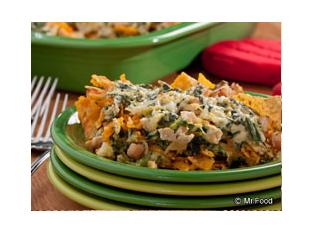 Layer half each of tortilla chips, chicken, spinach mixture, and cheese in a lightly greased 9- x 13- inch baking dish. Repeat layers, ending with spinach mixture.