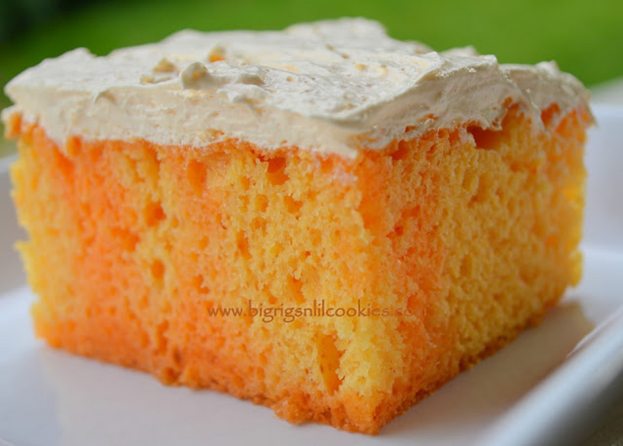 In large bowl, dissolve orange gelatin in boiling water. Add cold water. Reserve 1/2 cup of mixture, pouring remainder over cake. Cover and refrigerate for about 2 hours.