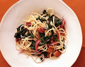 Add onion and saut over medium-high heat until softened, about 7 minutes. Add Swiss chard and sprinkle with salt and pepper. Add pasta cooking liquid to skillet.