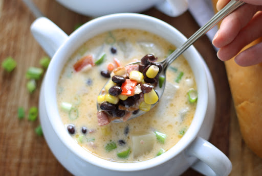 Add the chicken broth, potatoes, black beans, corn and diced red pepper. Cook for 10 minutes over medium high heat. Stir.