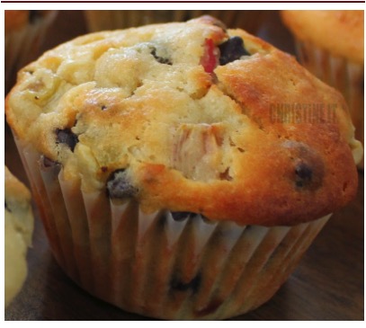 Mix dry ingredients together in a large bowl. In another bowl, whisk eggs, buttermilk, vanilla and butter. Make a well in dry ingredients and pour in liquid ingredients. Do not over mix. Fold in rhubarb and dark chocolate chips. Spoon batter into lined muffin cups, sprinkle dark chocolate chips on top and bake until golden. Bake at 350 for 20 minutes. This recipe makes 12 jumbo muffins.