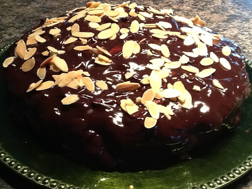 Mix well letting the chips melt, pore in the almonds leaving some for sprinkle.