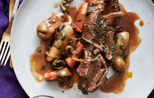 Add potatoes, carrots, and tomato paste (keep meat and vegetables submerged); cover and return to oven. Continue braising until meat is fork-tender and separates easily from the bone and vegetables are soft, 50–60 minutes longer.