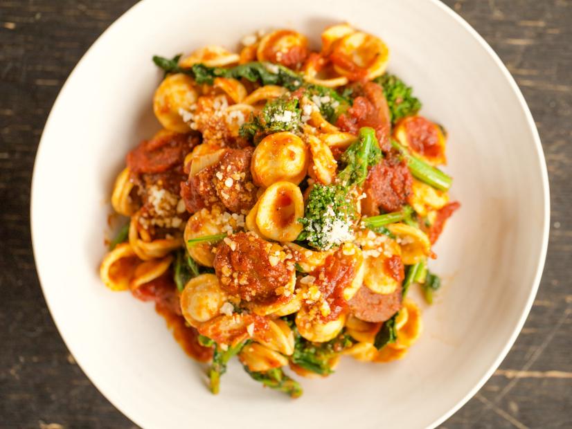 Bring a very large pot half filled with water to a boil and add 1 tablespoon of salt. Add the pasta and cook for 9 minutes exactly. While the pasta is cooking, trim the broccoli rabe to just below the leaves and discard the stems. Cut the leafy part of the broccoli rabe crosswise in 2-inch pieces. When the pasta has cooked for 9 minutes, add the broccoli rabe to the pasta and continue cooking for 2 to 3 minutes, until the pasta is al dente and the broccoli is crisp-tender. Drain in a large colander, reserving 1/2 cup of the cooking liquid, and add the pasta and broccoli to the pot with the tomato and sausage mixture. Stir in the Parmesan cheese and 1 teaspoon of salt. If the pasta seems dry, add some of the reserved cooking liquid. Taste for seasonings, and serve hot with extra Parmesan on the side.