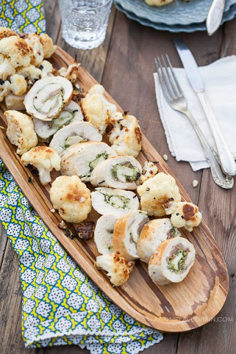 Spread the roasted cauliflower to the sides of the dish and add the browned roulades to the center of the dish. Continue roasting for 10 minutes, until chicken is cooked through.