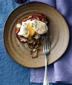 Top the bread with the tomatoes, mushrooms, eggs, and Parmesan. Season with ¼ teaspoon each salt and pepper and sprinkle with the chives.