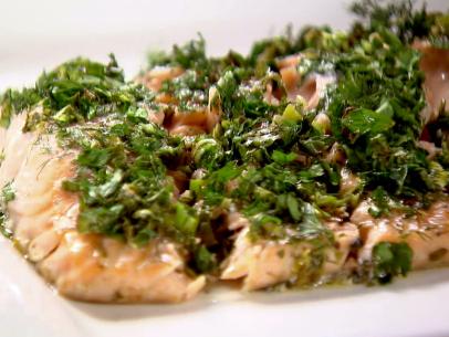 In a small bowl, stir together the scallions, dill, and parsley. Scatter the herb mixture over the salmon fillet, turning it so that both sides are generously coated with the green herbs. Pour the wine around the fish fillet.
