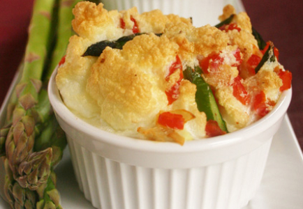 In a nonstick skillet, sauté the asparagus, pepper and onion with 1 tablespon water until soft. Stir in the cayenne pepper and salt. With a mixer, whip the egg whites and lemon juice until stiff peaks form. Divide the egg whites among four 12-ounce ramekins. Divide the sauteed vegetables equally among the ramekins and gently mix them in.