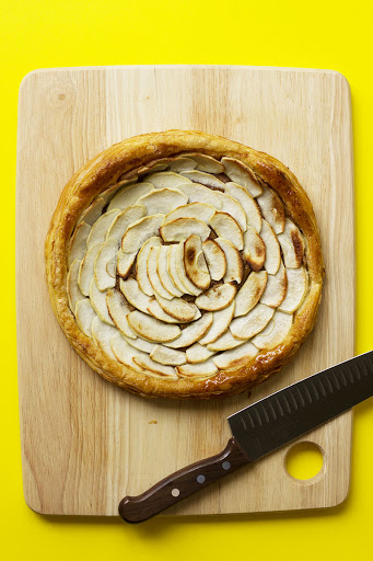 Spread the almond butter over the pastry, leaving the rim exposed, and then arrange the apple slices over the top in concentric circles, starting from the outside and working in.