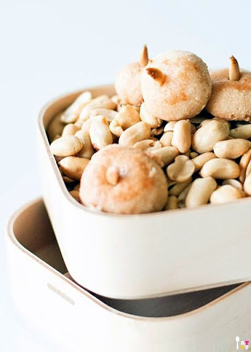 8. Put a little quartered peanut on top of each ball, then glaze it with the egg white. Put in the oven for 17 mins or until golden brown.