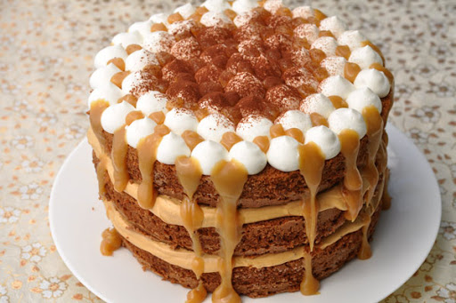 14. Place the second layer on the first and cover with remaining coffee cream. Place third cake layer on top.