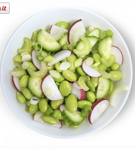Toss with 1-1/2 cup edamame, 1/2 cup cucumber, 1/2 cup celery, 1/4 cup radish, and 2 scallions.