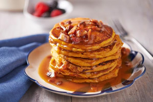 Pumpkin Pancakes with Salted-Caramel-Bacon Syrup