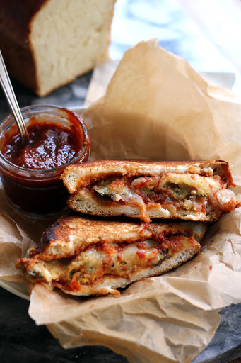 Eggplant Parmesan Grilled Cheese with Chili Tomato Jam