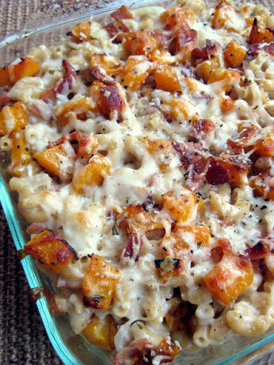 6. In a large bowl, toss to combine 3/4 of the roasted squash, the cooked pasta, 3/4 of the crumbled bacon, the sauce, and the Provolone and Parmesan (reserving some cheese to sprinkle on top). Pour into a lightly greased 9x9 baking dish. Top with the remaining bacon and squash. Sprinkle with the reserved cheese.