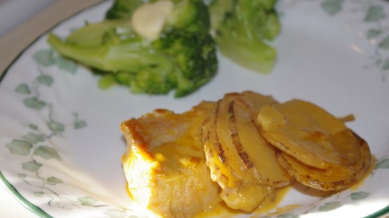 Line the bottom of a 9x13 inch baking pan with sliced potatoes. Arrange the pork chops on top of the potatoes.