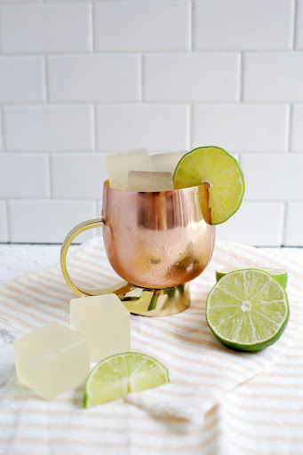 Push your jello cubes out from the bottom side of the tray (slide a knife around the edges as needed), and you're ready to serve! I love the cubes presented in Moscow Mule copper cups, so I would suggest that as a serving vessel if you have them (or it's just another excuse to buy some if you don't!). Isn't that such a pretty copper cup? I like my regular Moscow Mules a little more on the lime side, so adjust the lime quantity by using more ginger beer if you're not as into lime. I know it's hard to wait the long hours until your jello shots have set in the fridge, but don't despair! You have all the ingredients to make a liquid version of the cocktail right in front of you while you wait for the jello version to be ready. Cheers!