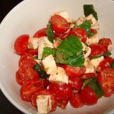 2. Place on round serving platter, start first with a slice of tomato, then mozzarella slice, then tomato and form a circle on the platter, placed remaining tomato and mozzarella in the middle