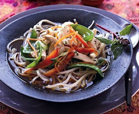 Place snowpeas and carrots in a colander; drain noodles over them; rinse; divide among 4 bowls.