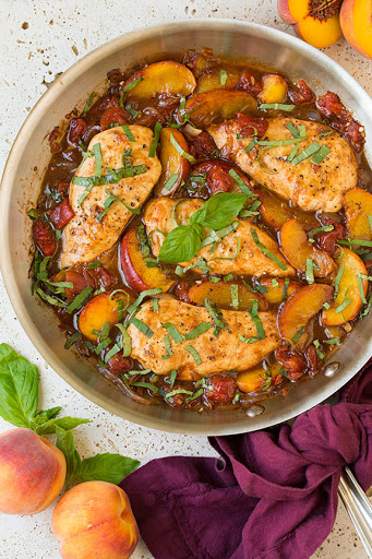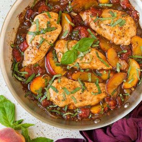 Heat olive oil in a large skillet over medium-high heat. Add onion and saute 3 minutes then push far to the side. Add chicken, season with salt and pepper and cook until golden, about 2 1/2 minutes per side. Remove chicken from skillet and transfer to a plate, while leaving oil and onions in skillet (if you don't have much oil left you can add another 1/2 Tbsp). Add garlic to skillet and saute 20 seconds (you can push onions back to center if you haven't already). Add balsamic vinegar and cook and stir until reduced by half, about 1 minute. Stir in honey then add in peaches and tomatoes and toss, season lightly with salt and pepper. Return chicken to skillet, nestling between peaches and tomatoes (you can lift some of the peaches and tomatoes over the chicken to create more room), cover skillet with lid, reduce heat to medium-low and allow to simmer until chicken has cooked through (it should register 165 degrees on an instant read thermometer), about 6 - 9 minutes. Top with fresh basil and serve warm.