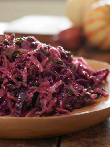 Sauté the bacon until browned and just crispy in a large stockpot. Add the onions and garlic and sauté until the onions are soft. Add the red and green cabbage, kale, stock, vinegar, sugar, salt, and pepper. Stir together, cover and bring to a simmer.
