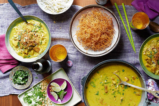 To serve, stir chopped cilantro into curry. Spoon a little sauce into bottom of each bowl or plate, then top with boiled noodles and a generous portion of curry. Garnish with fried noodles. Let guests add additional garnishes at table.