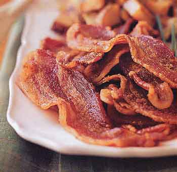 Arrange bacon slices in l layer on a large broiler pan and bake in middle of oven (or upper third of oven if baking with eggs) 20 minutes. Turn slices over and sprinkle evenly with spiced sugar. Continue baking until bacon is crisp and brown, 15 to 20 minutes more, then transfer to paper towels to drain.