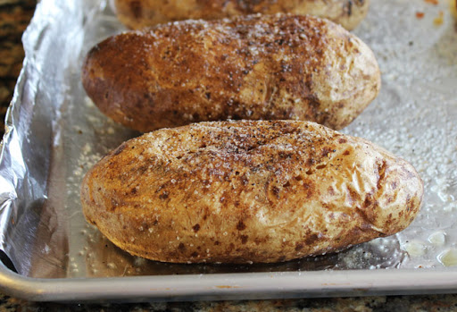 8. Pop them in the oven and bake for 45-60 minutes, or until the potato is soft on the inside.