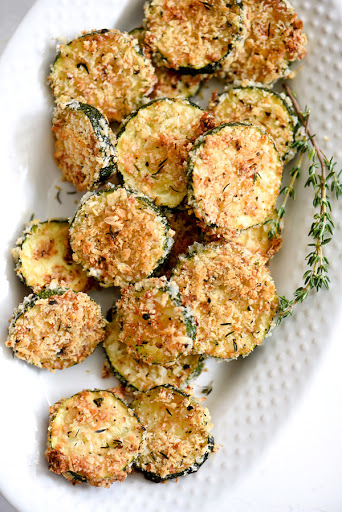 Dip the zucchini rounds into the egg white to coat both sides then using a fork, scoop the zucchini rounds into the panko bread crumb mixture and flip both sides, gently pressing the bread crumbs into the zucchini. Place in rows on the baking sheet and bake for 20-25 minutes or until the tops are golden and crisp.