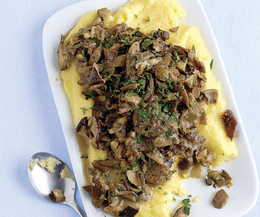 Bring 3-1/2 cups of water to a boil in a 4-quart heavy-duty saucepan over medium-high heat. Add 1-1/2 tsp. salt and then gradually whisk in the polenta. Cover, reduce the heat to low, and cook until the polenta absorbs the water and thickens, about 3 minutes. Stir in the remaining 2 Tbs. butter and the mascarpone. Add the Parmigiano and stir until combined. Serve the polenta topped with the mushroom ragoût and sprinkled with the remaining 1 Tbs. herbs.