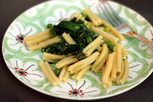 The resulting dish has just enough cream to envelop the pasta without weighing it down. Choose a pasta that's easy to eat with hunks of spinach and tiny peas, like farfalle or cavatappi.