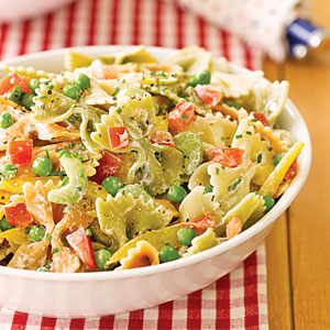 Make salad: Cook pasta according to package label directions, adding peas for the last minute. Drain and rinse under cold water to cool.