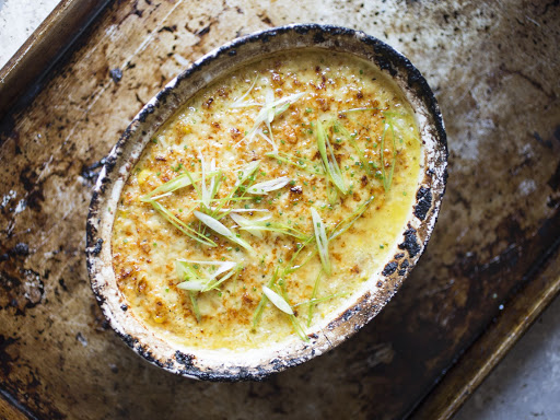Scrape the dip into an 8-inch baking dish, sprinkle with parmesan, and dot with butter; bake until bubbly, about 1 1⁄2 hours. Garnish with chives and scallions to serve.