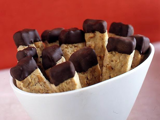 In a saucepan over lowest heat or in a double boiler, melt chocolate. Dip 1 end of cooled cookies into melted chocolate. Place back on cookie sheet to harden.