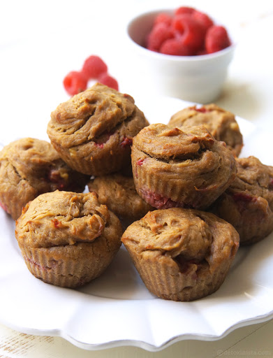 Preheat the oven to 350F and line a standard muffin tin with 12 baking cups. (I use these reusable silicone cups.) In a large mixing bowl use a fork to mash the ripe bananas until they have a puree-like consistency-- it's okay if there are a few lumps. Add in the peanut butter, buckwheat flour, maple syrup, salt, and baking soda and mix well until a sticky batter is created, then stir in the vinegar last. Fold in the fresh raspberries and divide the batter between the 12 muffin cups.