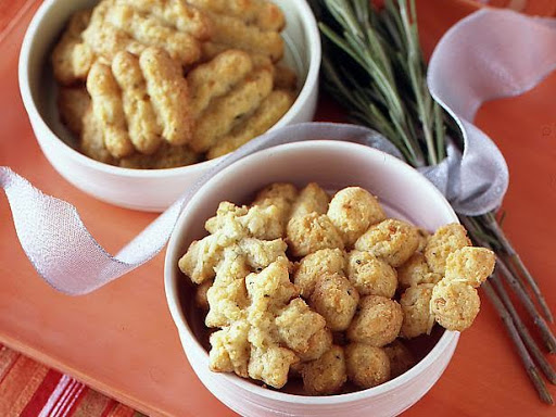 Some disk shapes work better than others. Since this is savory cookie, we liked the cutters that result in a cracker shape cookie, like the ribbon, clover. Stars and and snowflakes work, too.